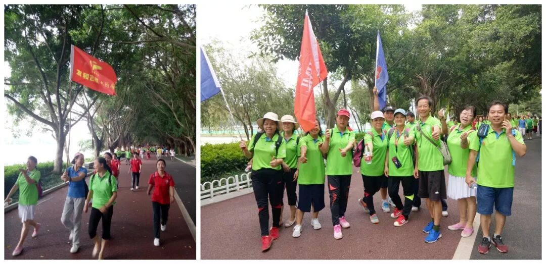 全体集合,整装待发!本次“健步走”的健将,年龄上到古稀之年,下到总角之年,来自健身爱好者、家庭小分队、民间小团体、社团组织等不同团体,不问大伙从哪里来,健将们的热情在燃烧!领队出发!