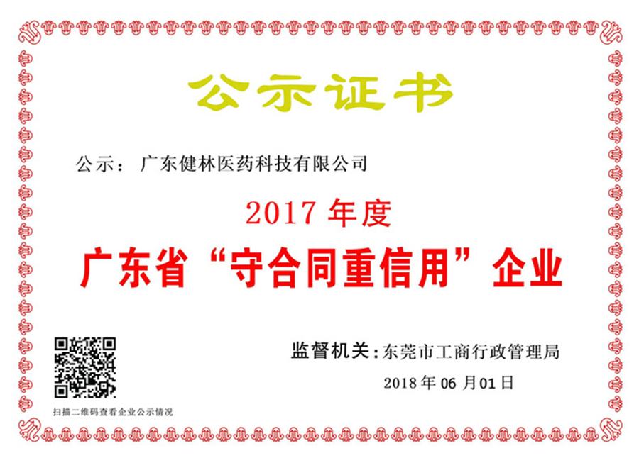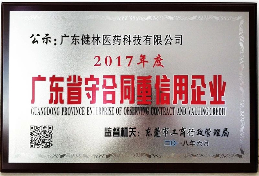 近日,健林健康凭借多年来的诚信经营和良好的合同履约信用,旗下智能工厂(广东健林医药科技有限公司)被评为2017年度“广东省‘守合同重信用’企业”,并在广东省工商行政管理局的守合同重信用企业公示系统中进行证书公示和授予荣誉牌匾。