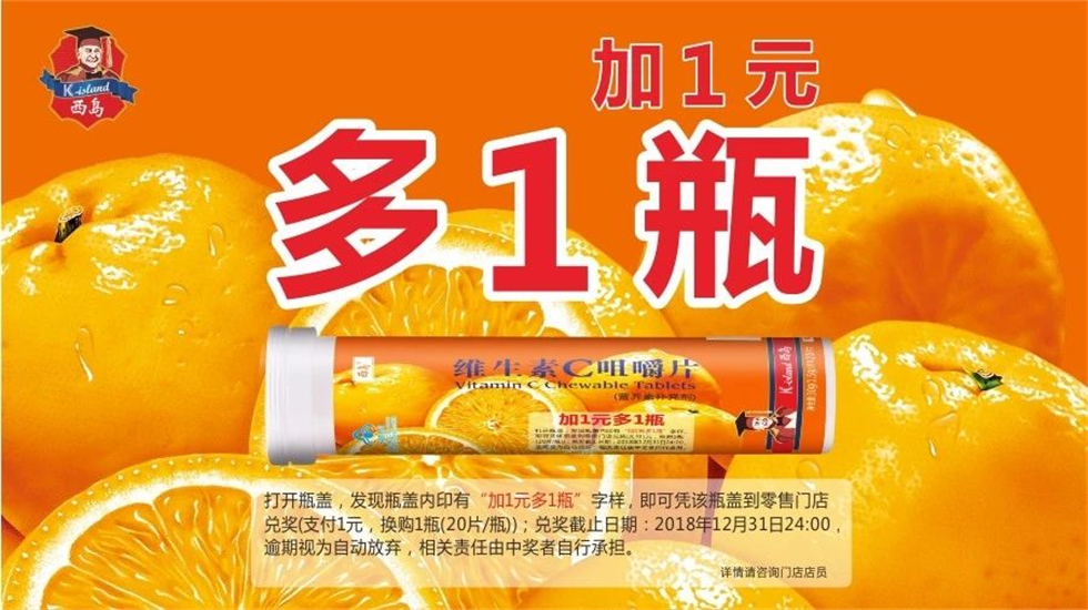 西岛维C“加1元多1瓶”活动现陆续在全国各地火热展开。凡购买西岛维生素C咀嚼片管装,打开瓶盖,发现瓶盖内印有“加1元多1瓶”字样,即可凭该瓶盖到零售门店兑奖(支付1元,换购1瓶20片维C)。具体兑奖及活动详情请咨询当地门店店员。