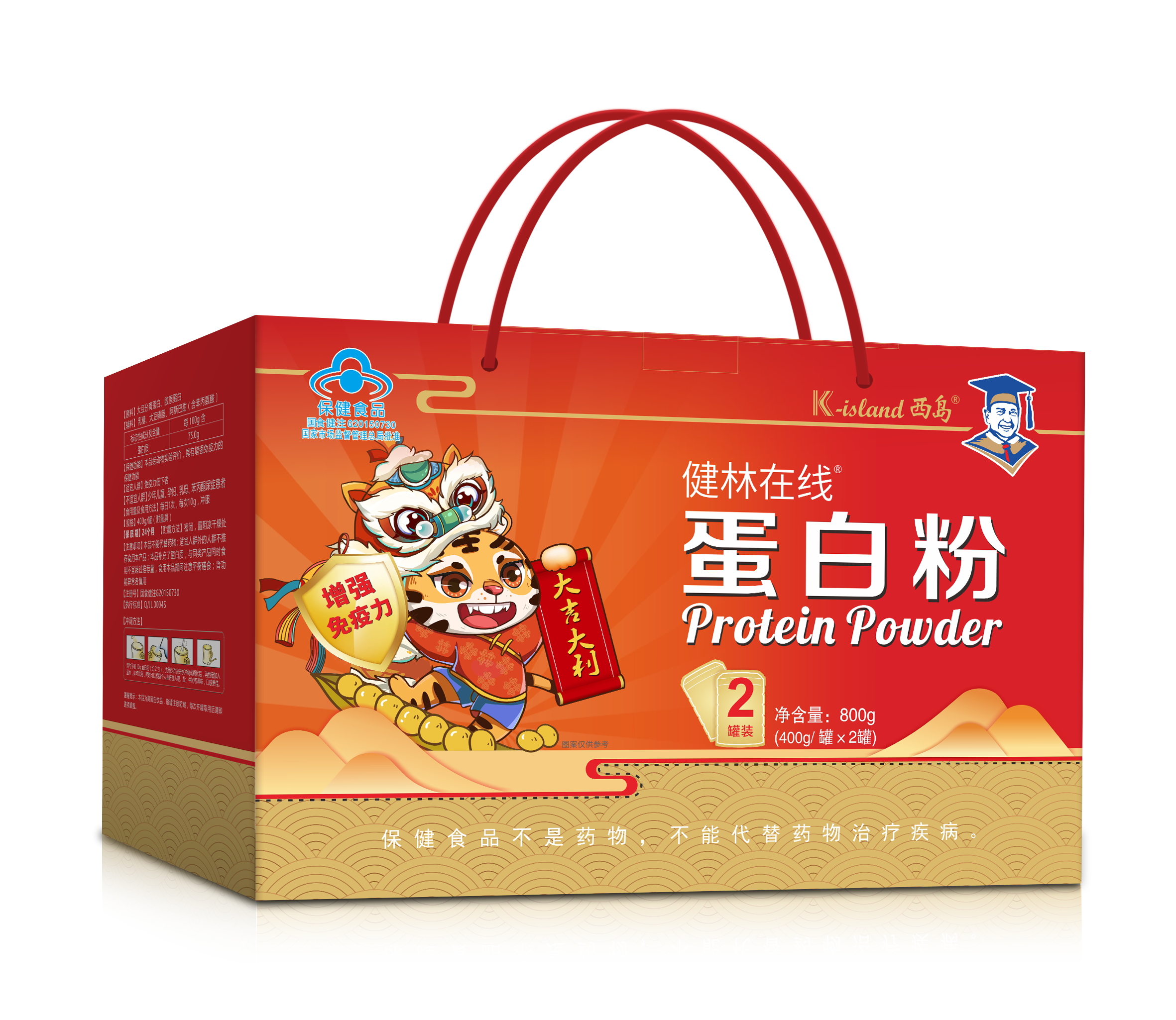 醒狮老虎、鱼鳞祥云、层叠山峰,共同构成一幅虎跃山河、千里送祝福的喜庆图景,大吉大利定制款蛋白粉化身新年送福礼盒,带给您全年福泰安康!