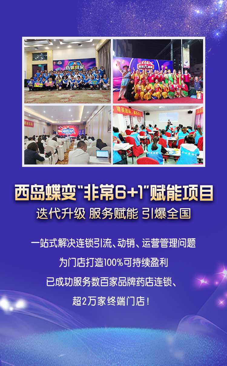 西岛蝶变“非常6+1”服务项目一站式解决药店连锁引流、动销、运营管理等一系列问题!全方位助力蛋白粉品类复购、增量,精准营销模式赋能终端药店红海突围,打造100%可持续盈利!健林健康已与全国数百家药店品牌连锁、超2万家终端门店建立了长期战略合作关系。
