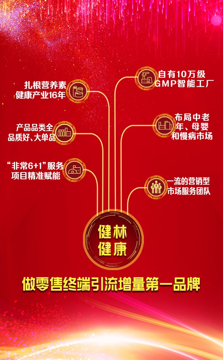 为药店连锁持续精准赋能、为药店连锁提供热销市场的健康产品,与药店连锁形成命运共同体,是健林的使命,也是健林的初心!健林健康与您共筑大健康产业辉煌事业!